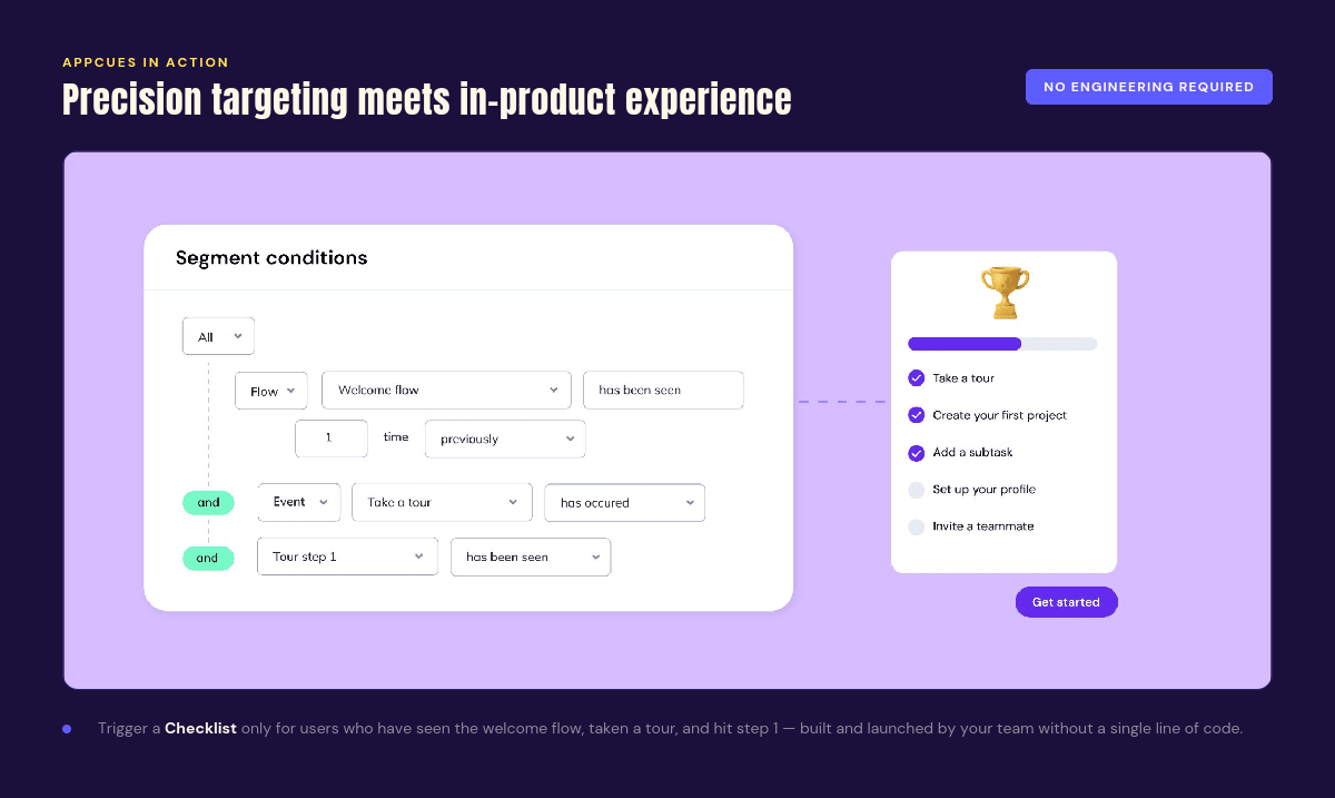 The result is a system where every experience is grounded in what users are actually doing, not just demographic attributes or time-based triggers. That behavioral foundation is what makes the in-product experiences feel relevant rather than generic — and it's what separates Appcues from tools that bolt in-app messaging onto a broader platform as an afterthought.