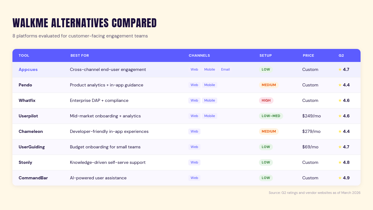 The top WalkMe alternatives for SaaS companies focused on customer-facing engagement include Appcues (cross-channel engagement), Pendo (analytics + in-app guidance), Userpilot (mid-market onboarding), and Chameleon (developer-friendly experiences). For employee-facing digital adoption, Whatfix and Userlane are strong options for large enterprises. The right fit depends on whether you need to guide users through your own product or help employees adopt internal tools.