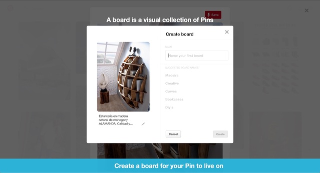 Contextual help in the banner below this modal is aimed to prompt action. The copy above—”A board is a visual collection of Pins”—helps a user understand the product.