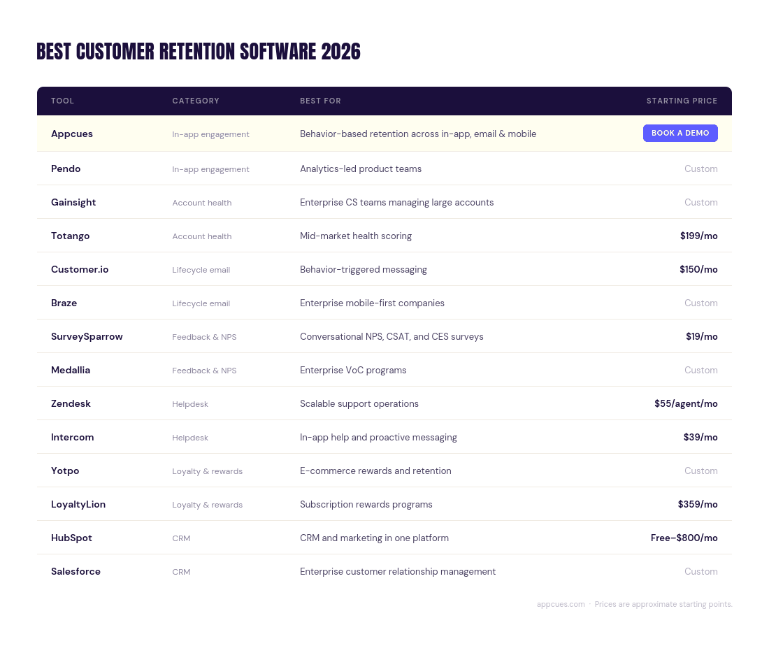The table below compares 14 customer retention software tools across four dimensions: the tool name, its category within the retention stack, what type of team or use case it's best suited for, and its starting price. Tools are grouped by category — from in-app engagement and account health scoring to lifecycle messaging, feedback collection, helpdesk, loyalty programs, and CRM — so you can quickly find the tools most relevant to your biggest retention gap.