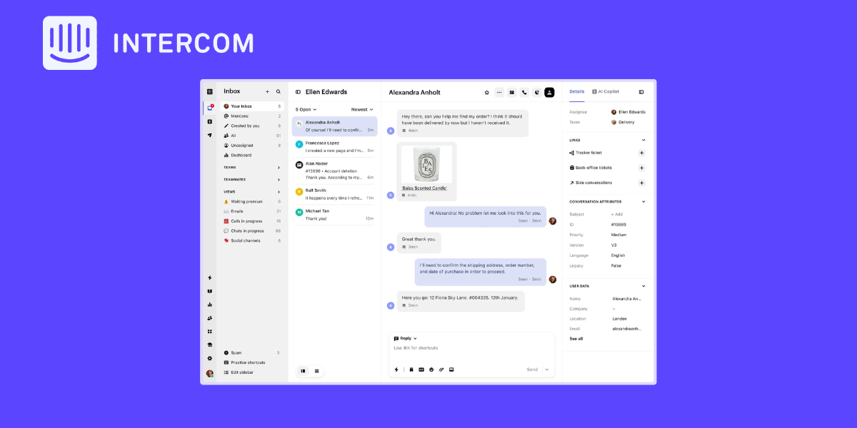 Key features: Live chat, Fin AI chatbot, Help Center, proactive in-app messaging, email.