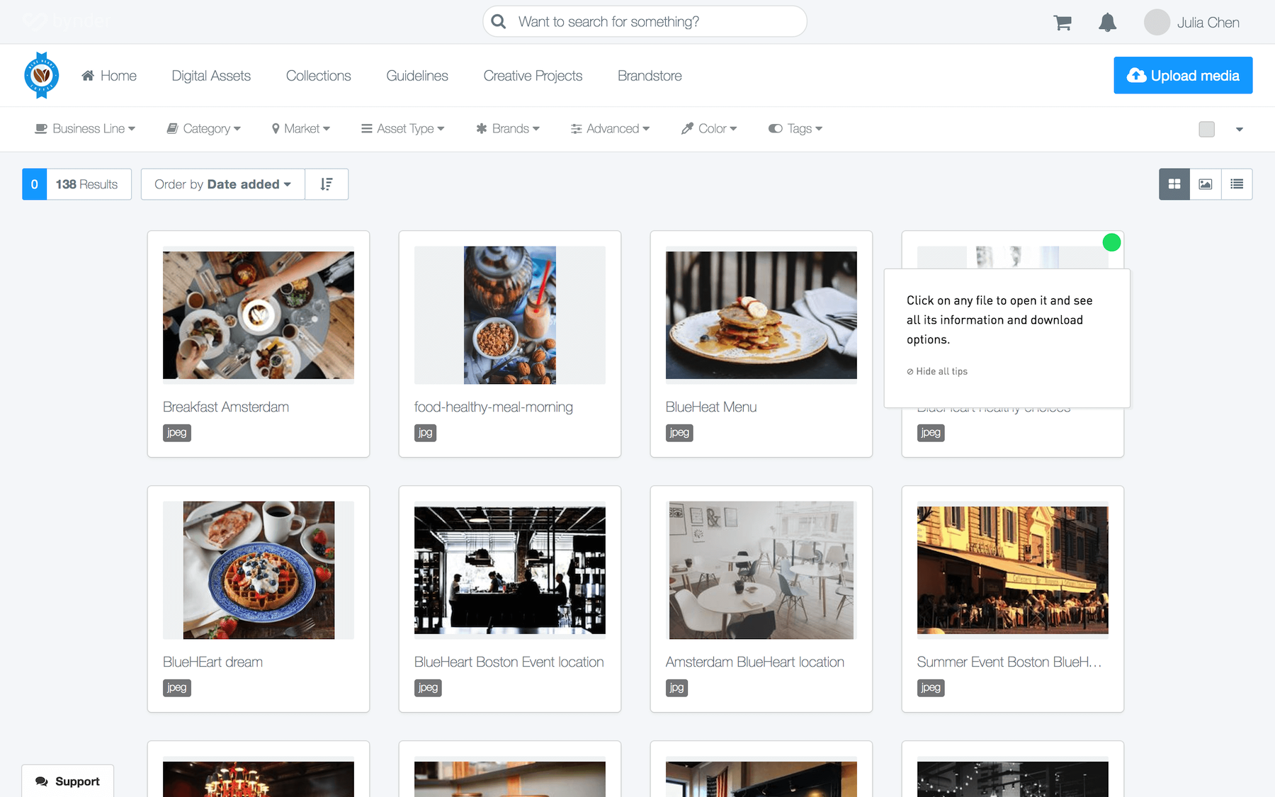 Users are then left in the product to explore a pre-setup Bynder account for an imaginary coffee company. A flashing help beacon (or hotspot) on the navigation bar gives guidance. After the video, users are mostly left to explore on their own.