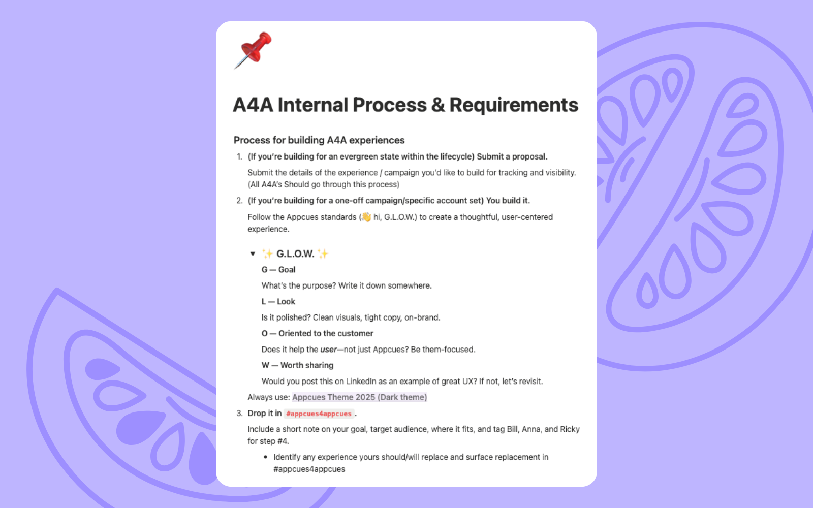 Before publishing, CSMs post their preview link in our #appcuesforappcues channel on Slack. That quick gut check helps make sure targeting, tone, and timing all line up—and nothing overlaps with existing lifecycle campaigns.